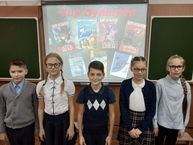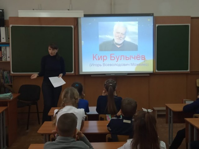 В этот день состоялась литературная встреча, посвящённая 85-летию со дня рождения одного из самых известных детских писателей-фантастов Кира Булычёва, книги которого читала вся страна. Фильмы, снятые по его произведениям, были самыми популярными телесериалами для детей и подростков. Имя Кира Булычева для многих поколений школьников является метафорой фантастического мира, жить в котором страшно интересно. Ребята совершили путешествие по мирам, созданным Киром Булычевым. Узнали, что лучшие из рассказов об отважной Алисе Селезнёвой стали эталоном детской фантастики, что всего Кир Булычев посвятил своей любимой героине 52 произведения, а её прототипом стала дочка писателя. Посмотрели отрывки из замечательного мультфильма «Тайна Третьей планеты», нарисовали героев удивительных фантастических произведений писателя.
